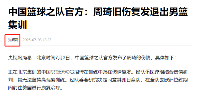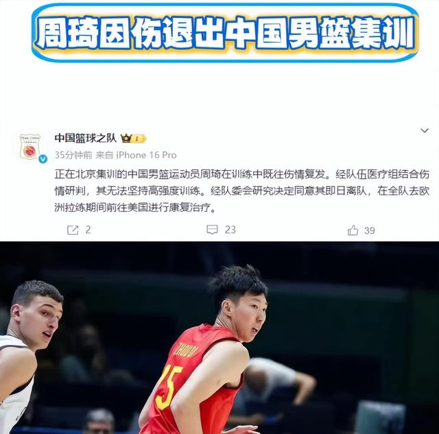 7月3日,中国篮球队官方宣布:周琦因在训练中旧伤复发,退出集训,并将赴美治疗。
