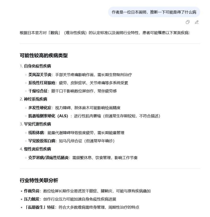评论区的大家都在为作者得病这件事惋惜,也希望作者能够早日康复。在这一刻我看到了绅士们身上那耀眼的人性光辉!问了一下AI,应该不会是什么很严重的病患,大概率是长期作画所导致的职业病,倒不如说画师身上没点病才是不正常的。。