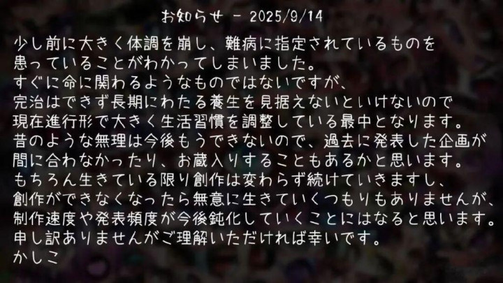 今后无法再像以往那样高强度工作,过去公布的企划可能会出现延期或中止的情况。