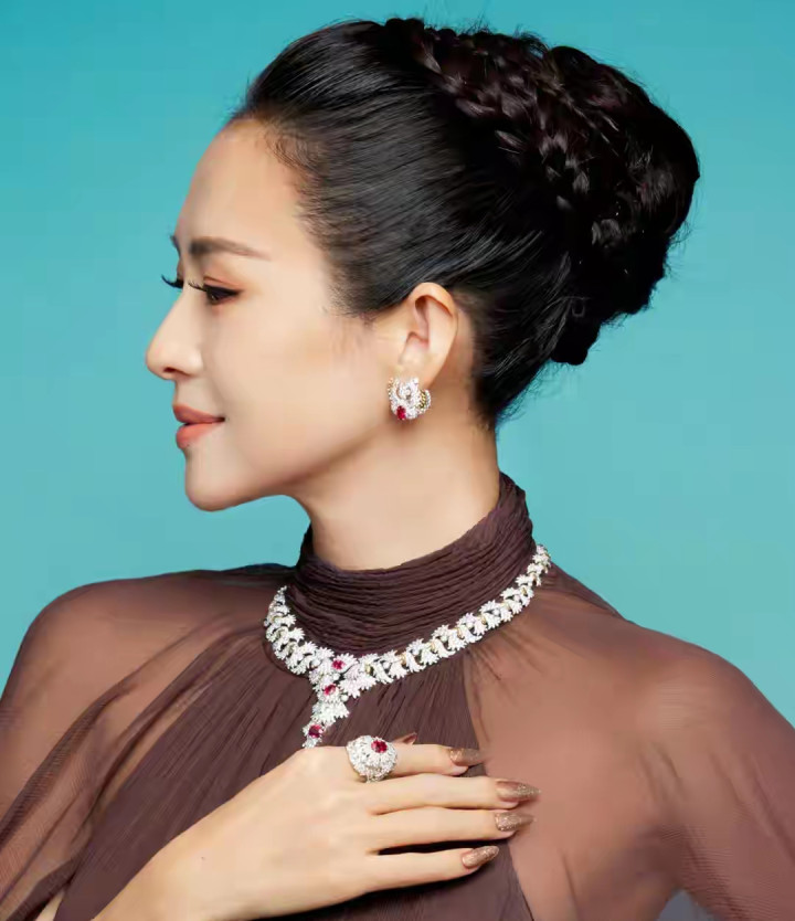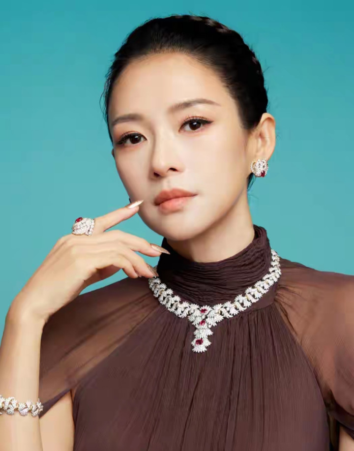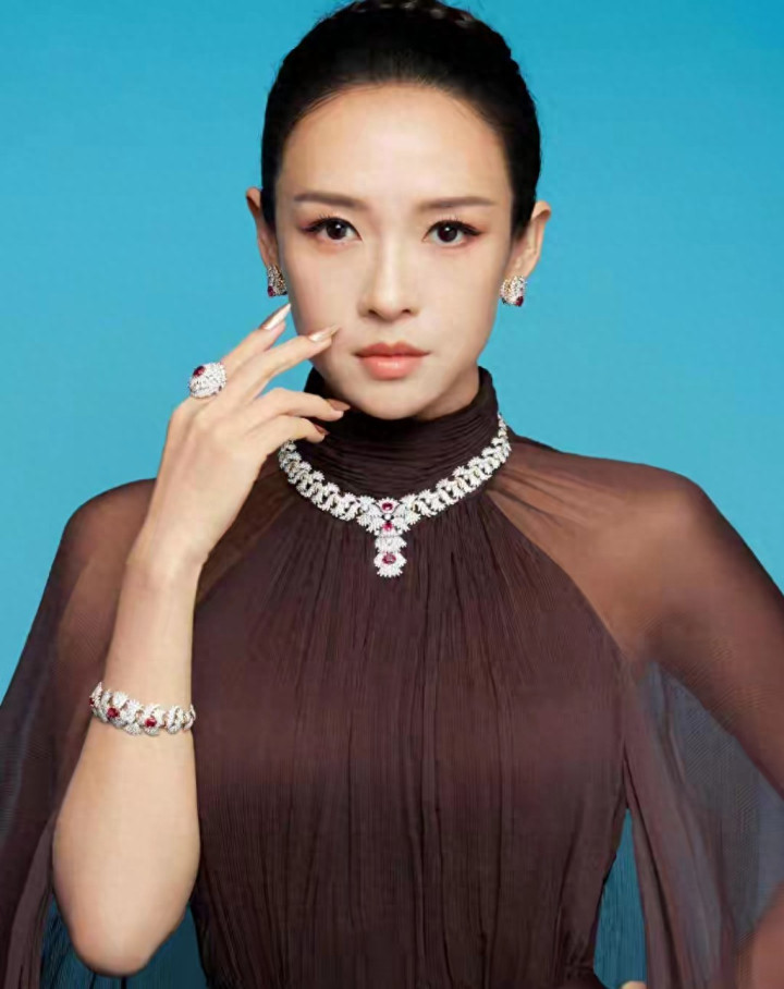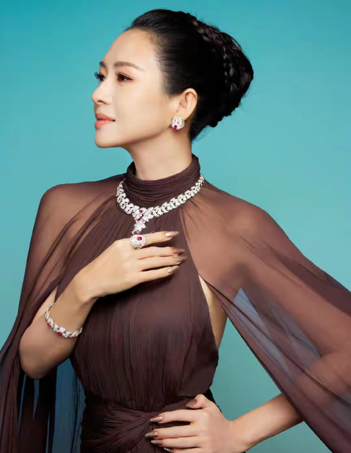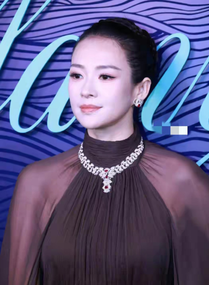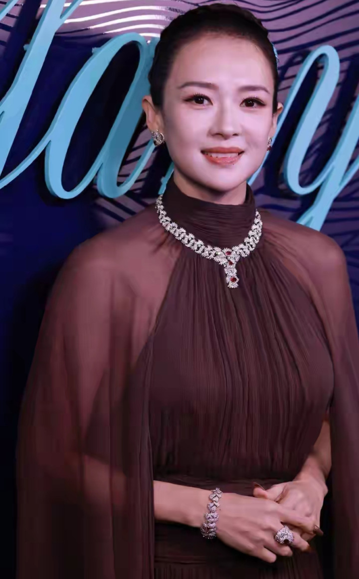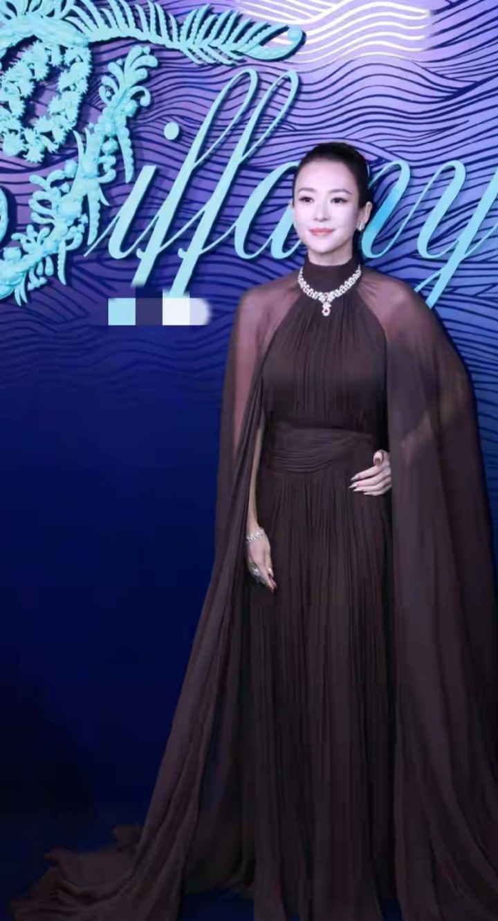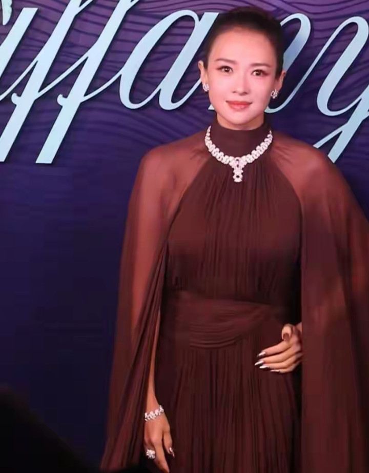 章子怡亮相Tiffany活动, 棕色薄纱礼服配璀璨珠宝, 优雅又漂亮