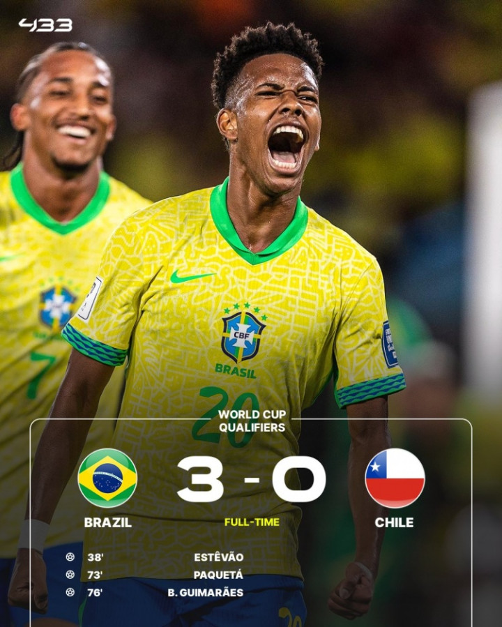 直播吧9月5日讯南美世预赛,巴西主场3-0完胜智利。本场比赛,切尔西小将埃斯特旺门前倒钩打进自己在巴西国家队的首球。