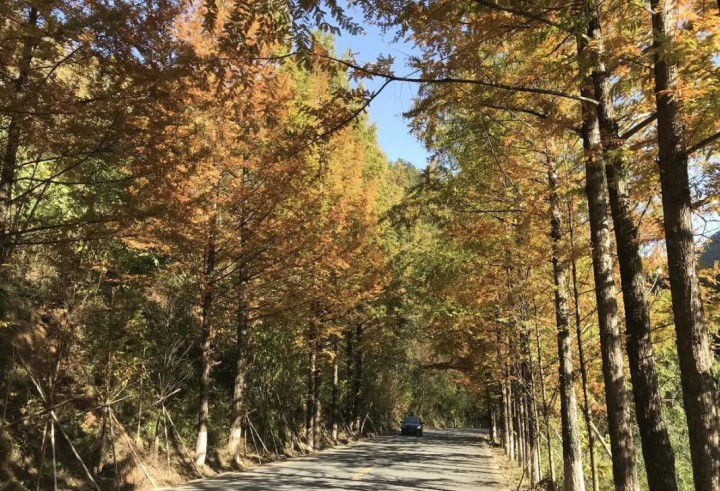 你是否想过在一条公路上能看到如此丰富的植被变化? 高江路沿线的树种包括杉树、法国梧桐、金丝柳、银杏、刺槐、樱花树等。 深秋时节水杉由绿转红形成一条蜿蜒于山间的“金色河流”。 最佳观赏期是每年霜降后到11月上旬的十来天里金红色针叶随风飘散在公路两侧铺就红褐色地毯。