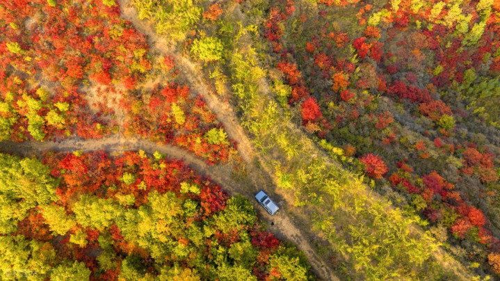 第一站,从你的城市出发,导航到焦作大底村,10月中旬到11月中旬,这里有漫山遍野的红叶,你可以走进其中,和高高低低的红叶黄叶绿叶同框,站在这一望无际的多彩树叶林里,感受大自然的辽阔与秋天的美好。
