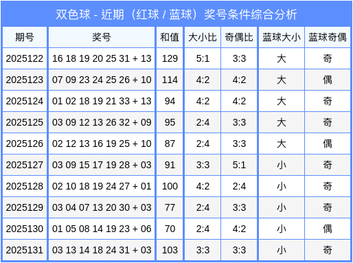 蓝球大小分析:最近10期大小比为5:5,大小走势为:大-大-大-大-大-小-小-小-小-小,本期注意蓝球开出小数球。