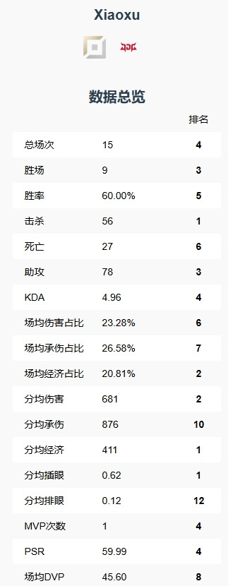 数据网站显示,自第一赛段开赛以来,xiaoxu多项数据都位列上单位上游,其中56的总击杀位列第一、4.96的KDA位列第四、分均伤害位列第二!