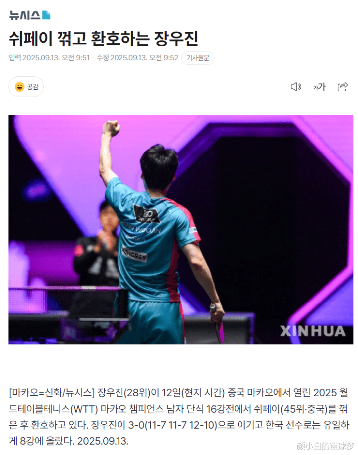 张禹珍也直接登上了韩媒的封面,他单手握拳指天,文中写道,世界排名28的张禹珍接连击败卡尔伯格、薛飞晋级到澳门冠军赛男单八强,他是韩乒唯一进入八强的选手。
