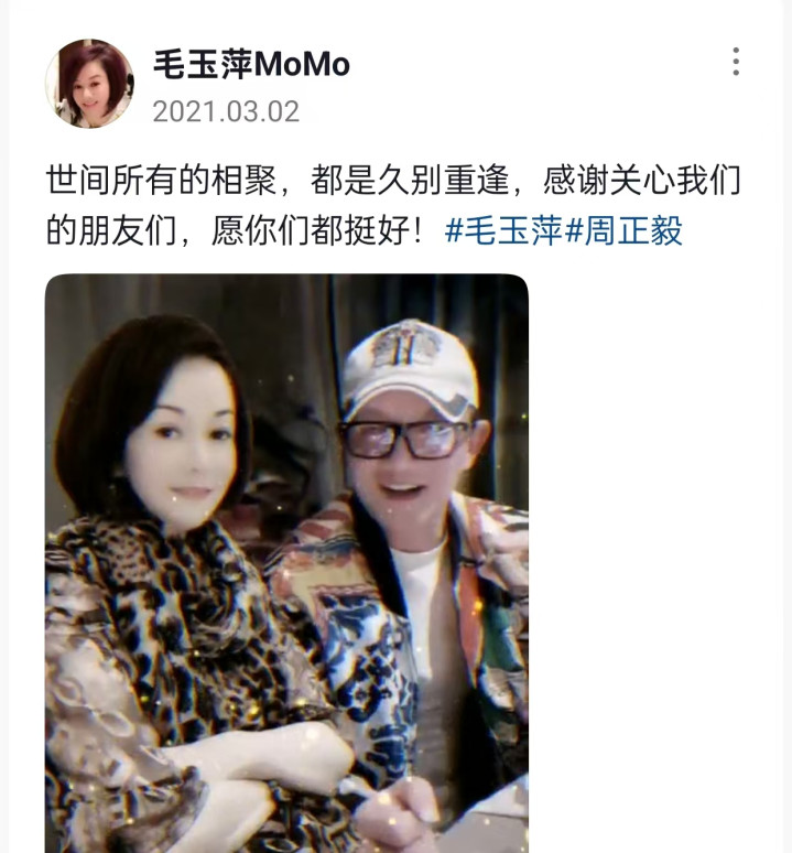 其实,毛玉萍对周正毅的感情非常深,哪怕周正毅转移资产,她依旧深爱着他,2021年3月发两人合体照片,感谢关心他们的朋友。