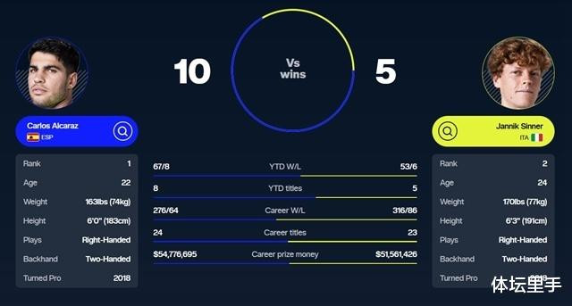 据统计,阿卡辛纳此前一共交手15次,阿卡10胜5负占据明显优势,其中在本赛季,阿卡辛纳就已经有了5次巅峰对决,而且都是在决赛,阿卡赢下了其中的4次,分别是美网、法网、辛辛那提、罗马,辛纳则是赢下了温网。如今,在年终总决赛,阿卡辛纳将迎来生涯第16次交锋,也是本年度第6次“辛卡决”,还是在冠亚军决赛,谁能捧杯,拭目以待!